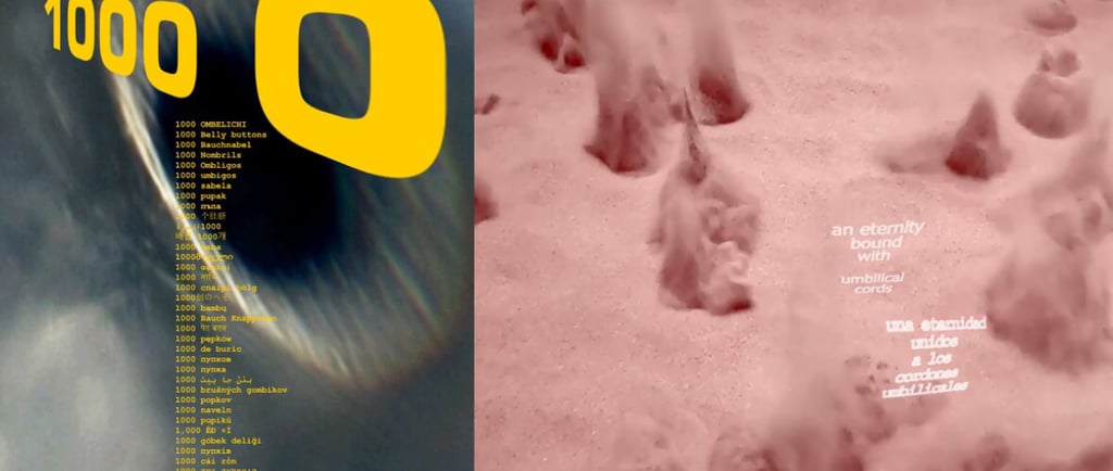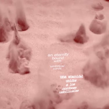 An artificial umbilical cord inflates into cartoon bubbles with embryonic thoughts of a fetus. In English with embedded French-German-Italian or Spanish text.