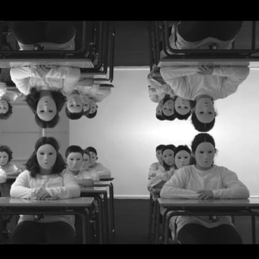 In a school without spirit, in a dark and decrepit classroom a class is being taught, the students and the teacher wear white masks.